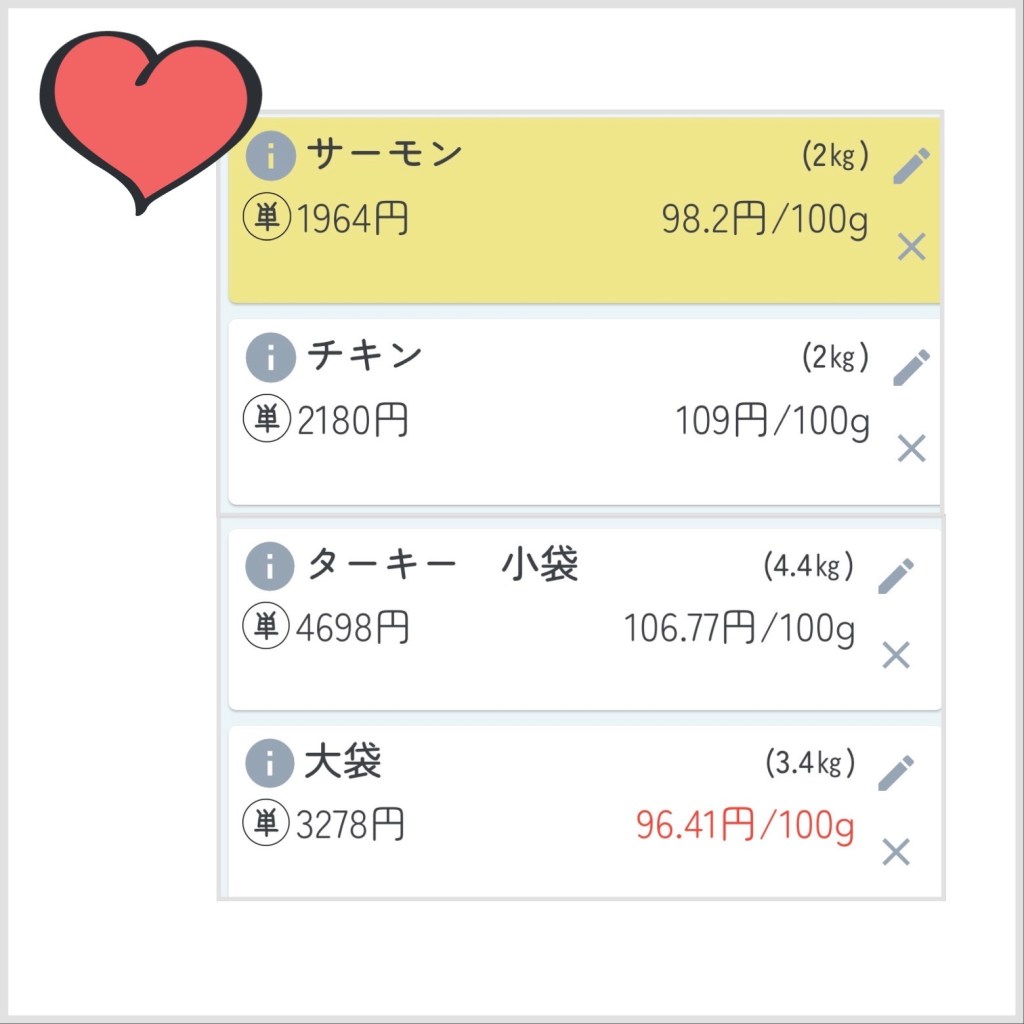 トラきちひとりなので、小分けにしているサーモンにしましたが、100gあたり、1.8円しか大袋と違わないとわかりました。