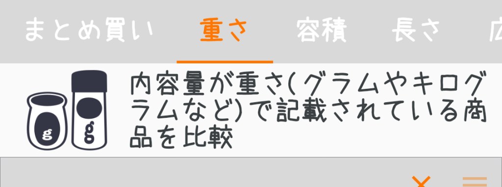 次に比較の仕方を選択します。選択肢がたくさんあって迷っちゃうけど、カリカリとかは「重さ」を選びましょう。