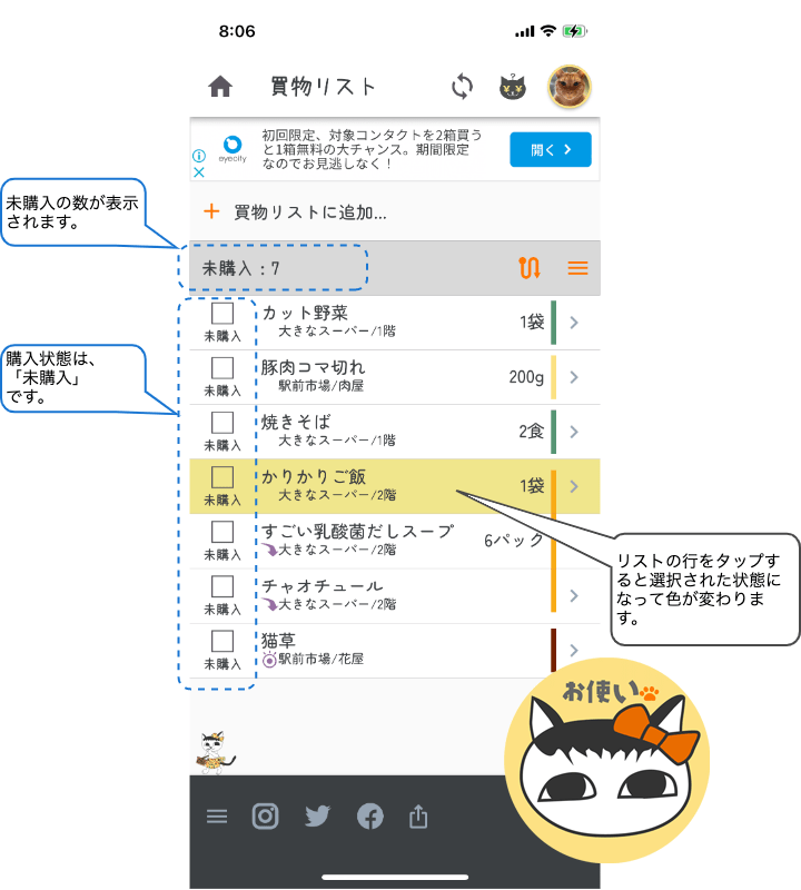 買い物リストに商品を追加したら、操作したい商品の行をタップします。タップすると行の色が変わります。選択行はこの色になります。