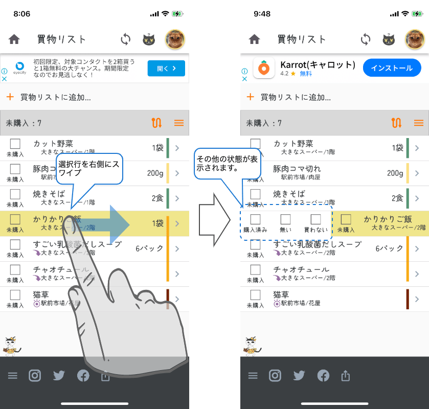 「無い」や「買わない」状態にするには、対象となる商品をタップして選択状態にします。その後に選択行を右側にスワイプしてから、選択したい状態をタップします。