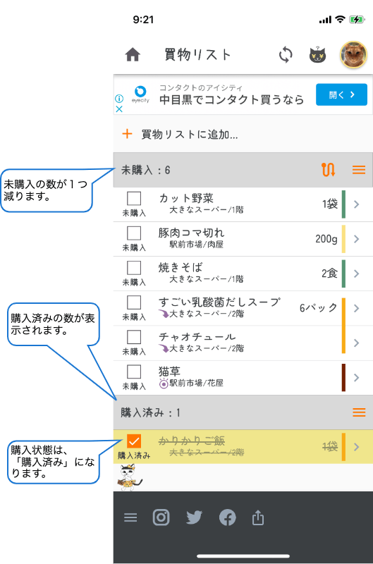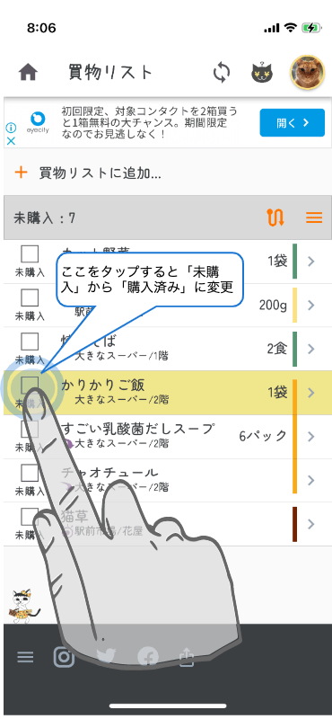 選択した行の左側にある四角をタップすると「未購入」の状態から、「購入済み」の状態に変わります。
