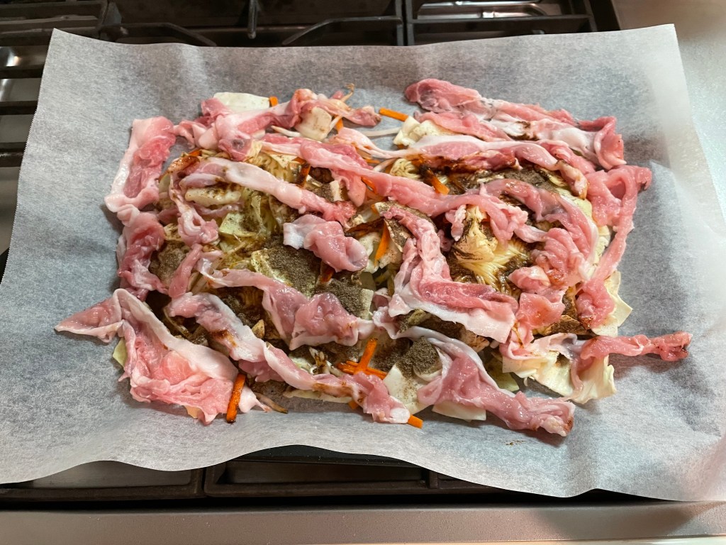 ヘルシオ付属の角皿に、クッキングペーパーを敷いて材料を麺、野菜、ソース、豚肉の順に重ねていきます。