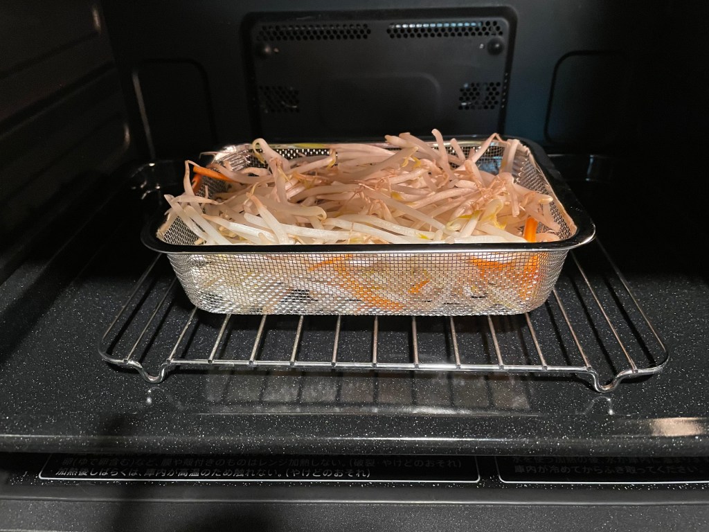 ヘルシオは混ぜてはくれないので、出来上がったら、もやしと一緒によく混ぜます。