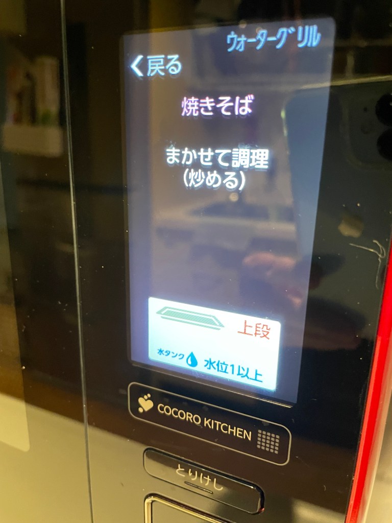 焼きそばはメニューにあるので、まかせて調理の焼きそばを選びます。後は、ヘルシオにお任せします。スタート時に「弱め」「標準」「強め」を選択できますので、今回は強めでスタートしました。