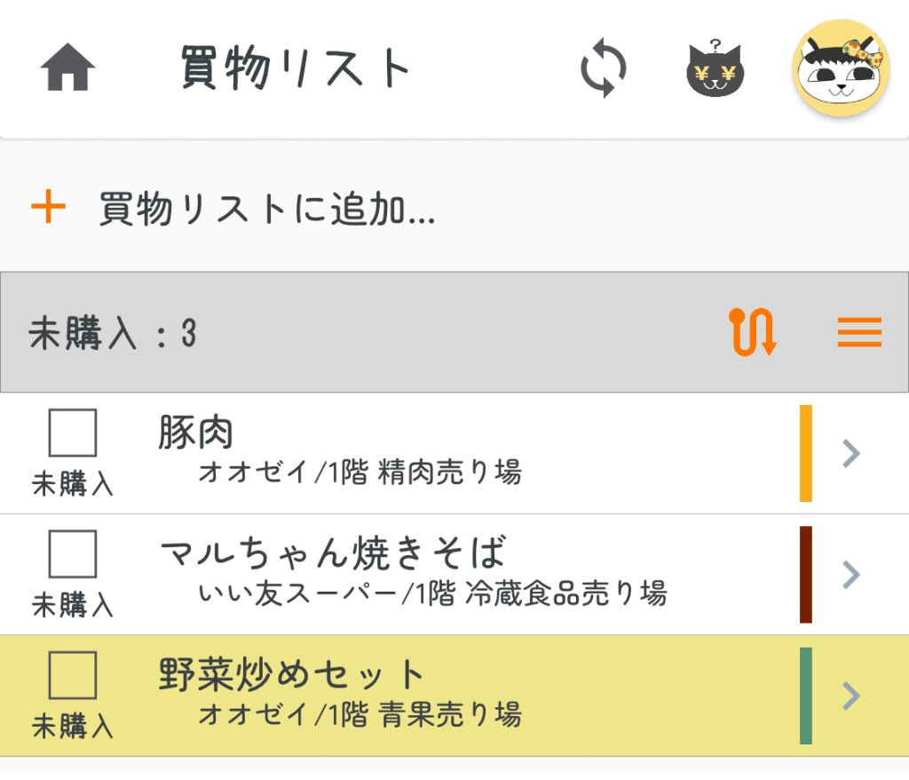 まず、焼きそばの材料を買います。買い物に行く人に【お使いブギー】の買い物リストで「これ買ってきてね」とお願いします。