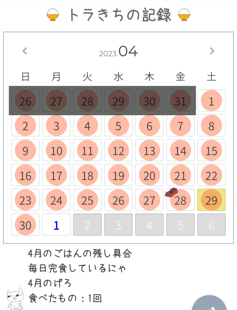 トラきちは毎日完食です。1度だけ食べたものを全て吐きましたが、この日も完食しました。トラきち、ゆっくり食べようね。