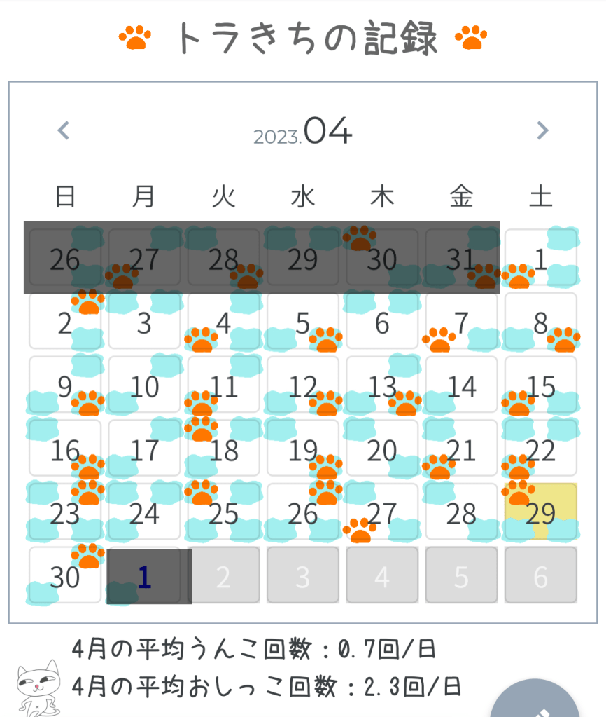 4月の平均うんこ回数は、0.7回/日となり、3月に引き続いてちょっと低調気味でした。だいたい1週間に5日ペースです。ただし、おしっこ回数は、月平均1日当たり2.3回となり、3月の2.2回よりもアップして、よい結果となりました。