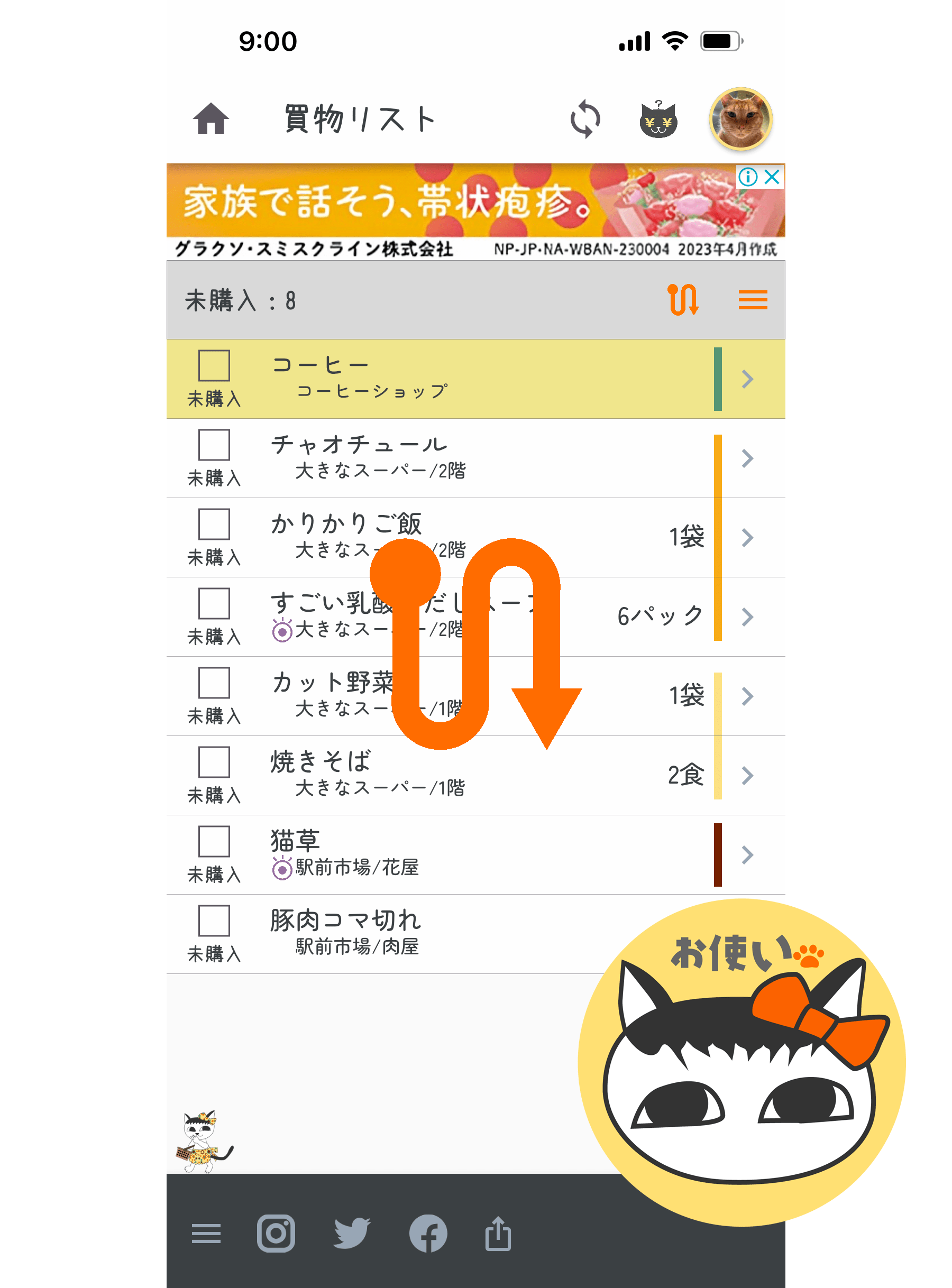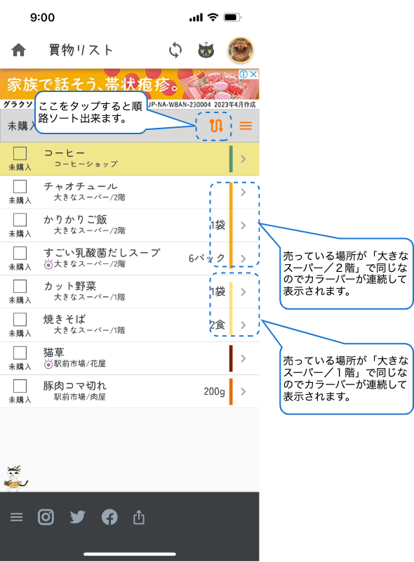 順路ソート」アイコンをタップすると「売っている場所」毎にリストの順番が並べ替えられます。