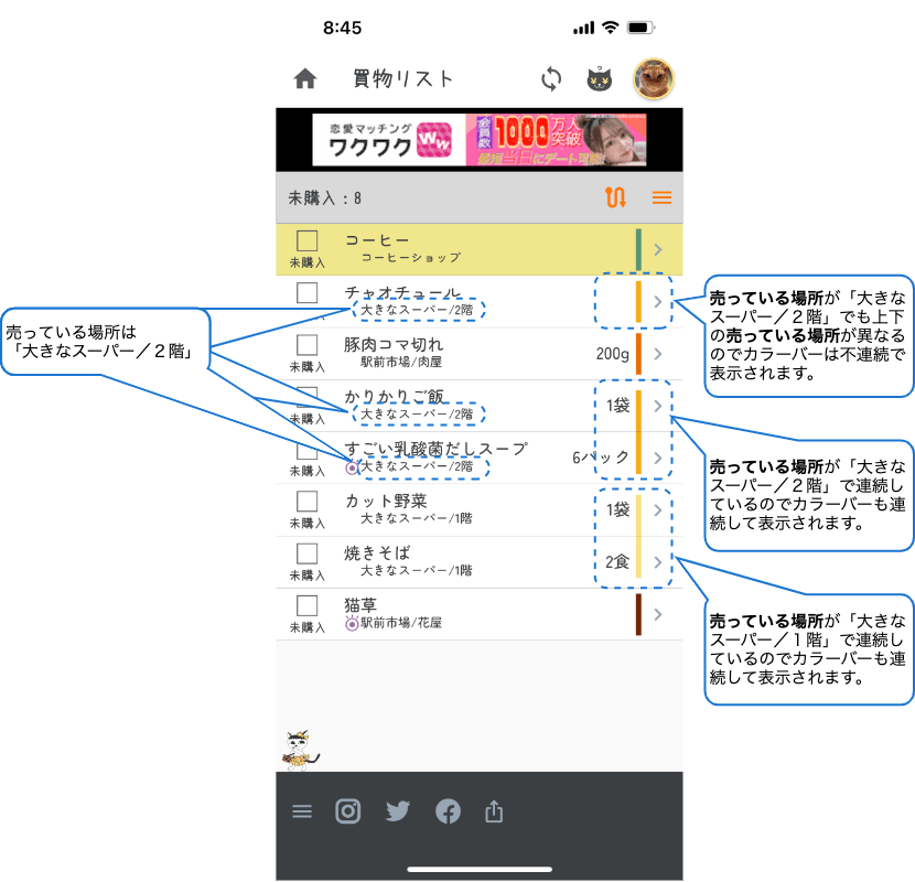 「買う物」に「売っている場所」が設定されていると、リストに名称が表示されます。リストの右側には、売っている場所毎に色分けしたカラーバーが表示されます。カラーバーの色は特に重要ではありませんが、リストの上下で「売っている場所」が同じ場合は、カラーバーが1本に繋がります。