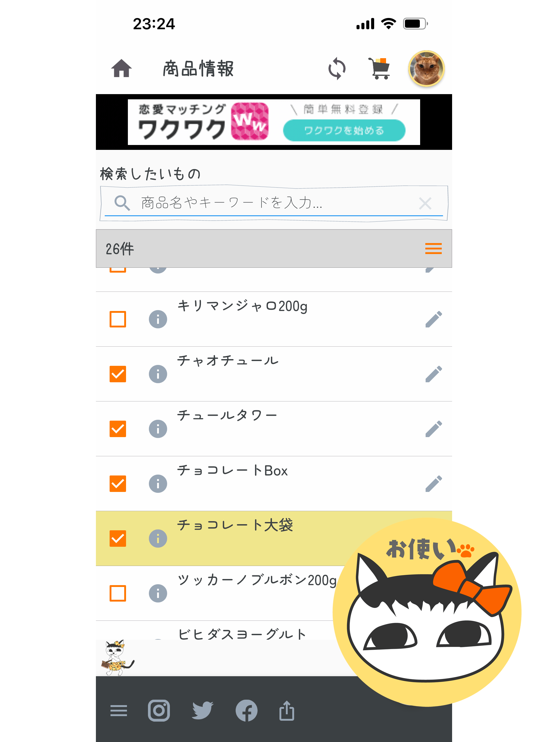 買い物リストに追加した事がある商品は自動的に登録されますが、この「商品情報」画面でも追加は可能です。画面右下にあるプラス