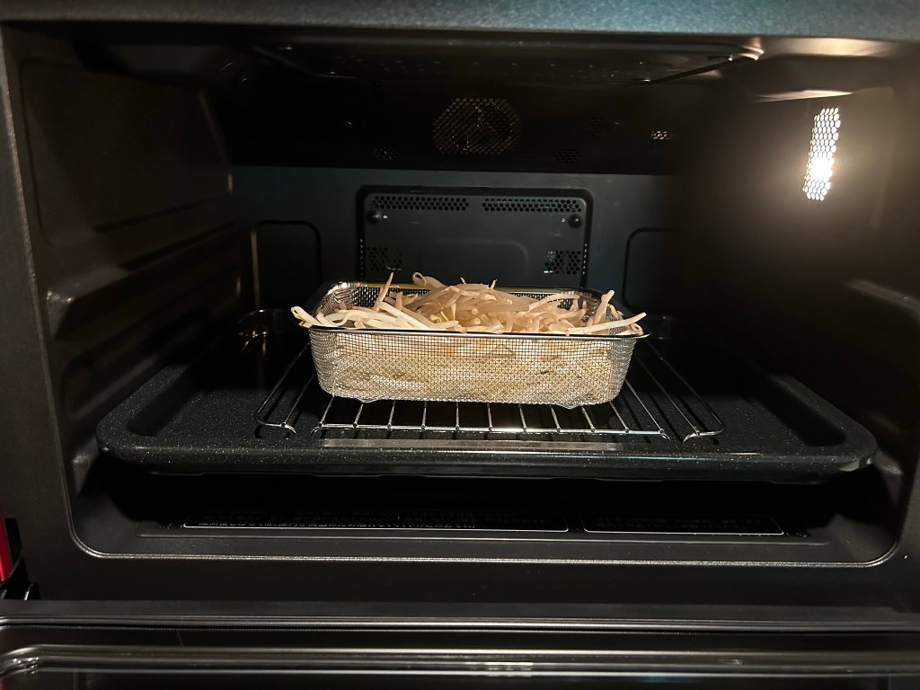 シーフードミックスを解凍しなかったのが祟って、かなりお水が出てしまいました。シーフードの表面はそれなりに焦げ目もついていましたが、こんなにお水が。。ヘルシオの角皿と呼ばれる天板は水が移動するように真ん中を高くしてあるので、何とか水を集めて別にすることができました。。