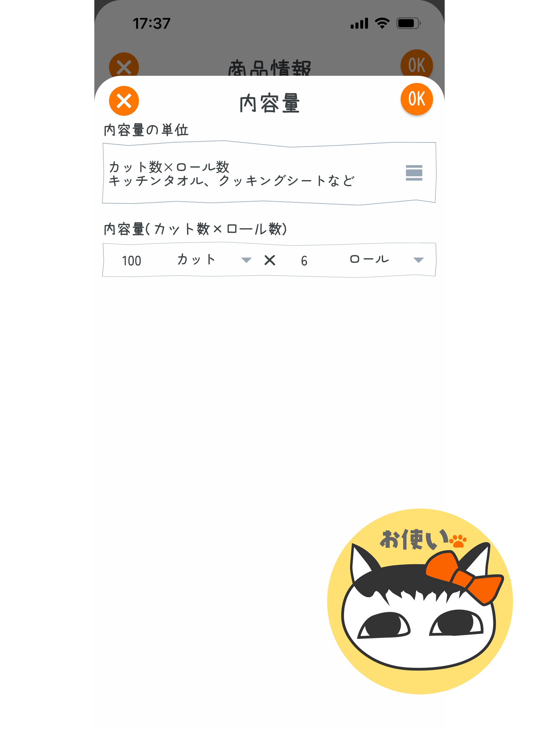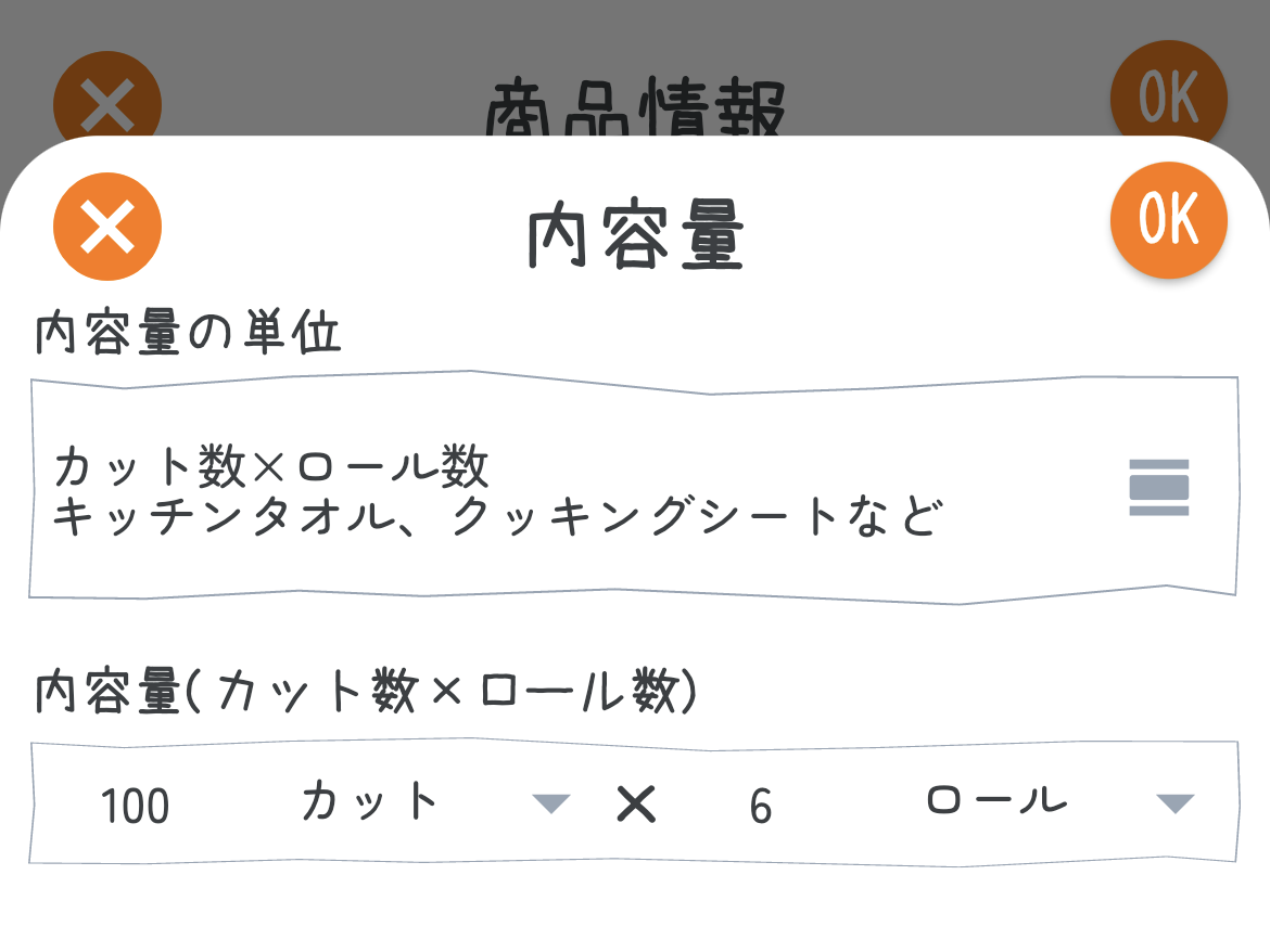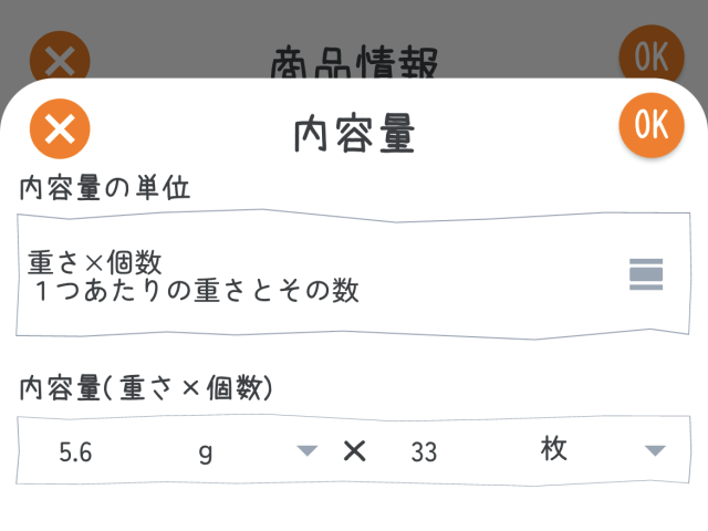 内容量の入力画面では、上に「内容量の単位」、下に「内容量」の入力フィールドが配置されています。