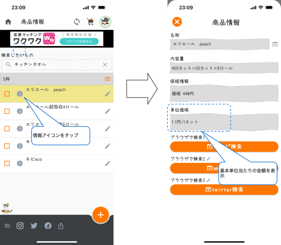内容量と価格が登録されていると、買い物の際に商品を比較するのに役立ちます。内容量と価格から、基本単位当たりの金額を計算します。