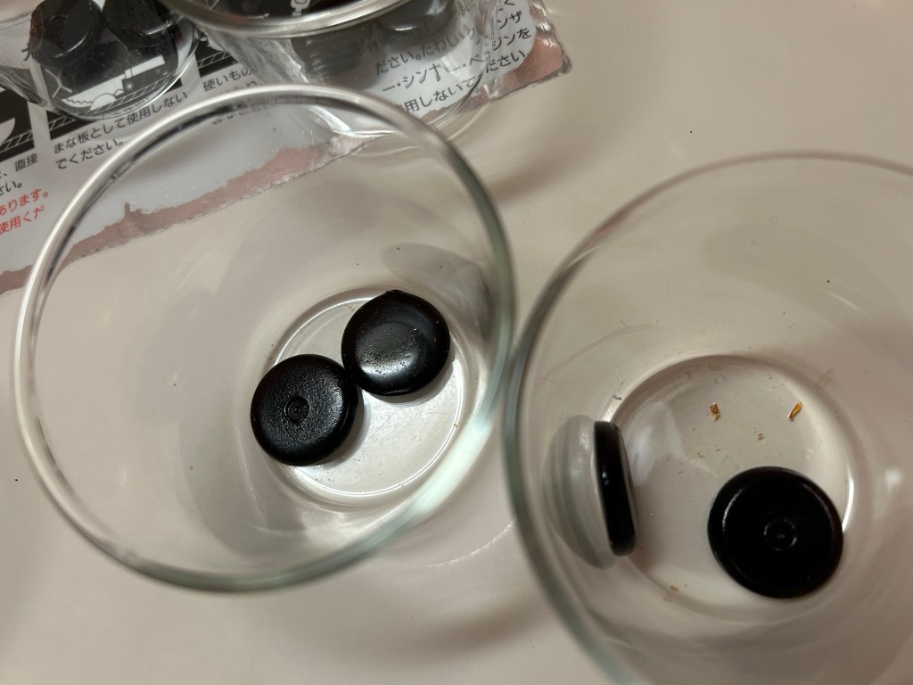 下の写真は、左が前回作ったもので右が今回ビターで作ったものです。右の方がカラメルが流れていて、固まり度が緩いように見えます。ただし、気温からくるヘルシオの温まり度や牛乳の温度も関係している可能性もあり、ビターのカラメルタブレットの方が固まらないということは確実に言えないのですが。。