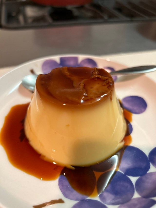 ビターなカラメルは、もっと固めのプリンに合うような気がしました。今のレシピは白身と黄身の割合は1:1で、白身が余らないところが気に入っているのですが、ビターなカラメルにはもっと黄身の割合を増やして硬くした方がいいかも。