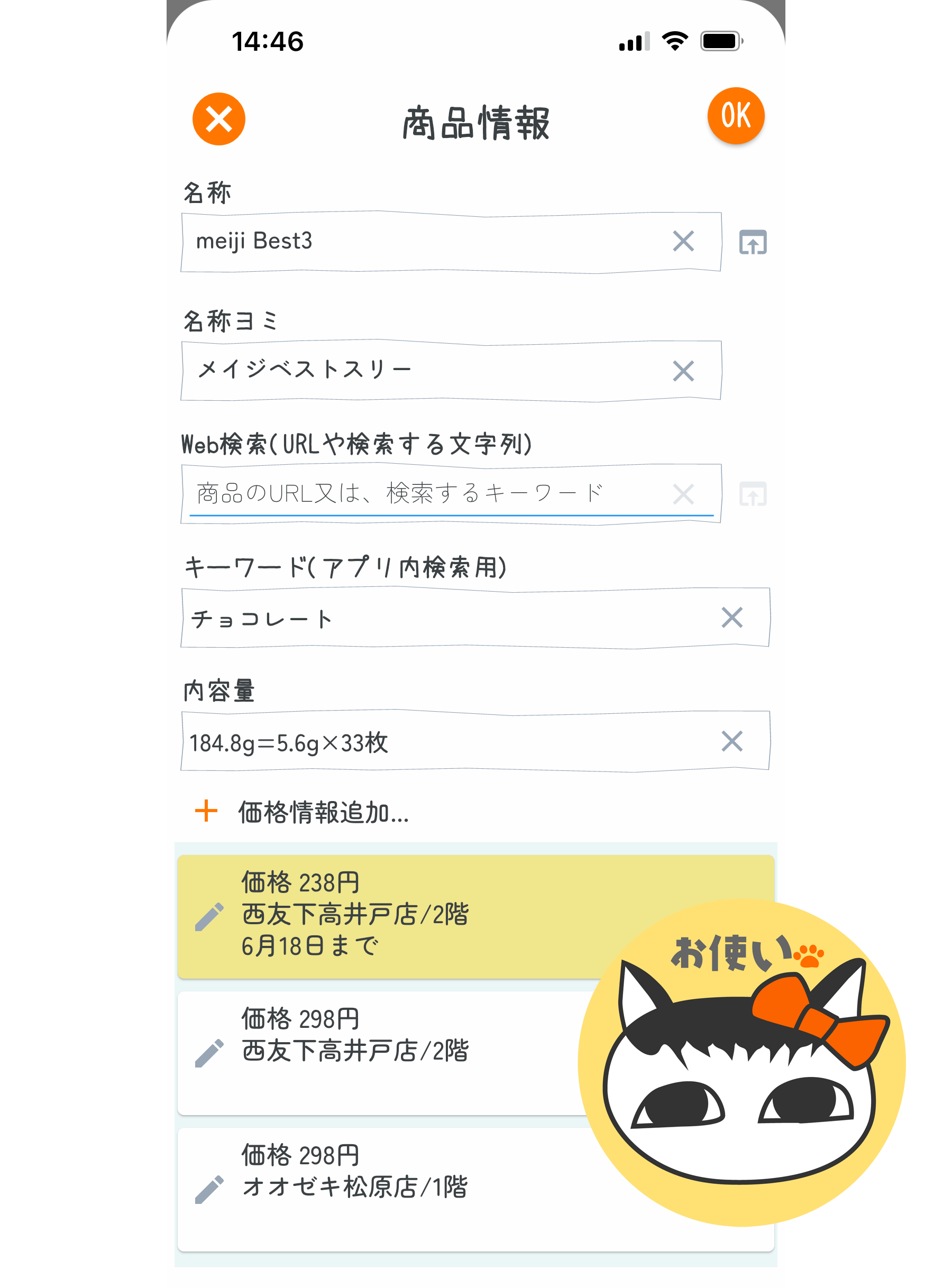 「価格情報」と「内容量」を入力しておくと基本単位当たりの価格を計算出来るので違う商品との比較の際に役に立ちますが、価格情報だけをメモがわりに入力しておいても役に立ちます。