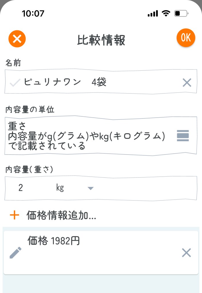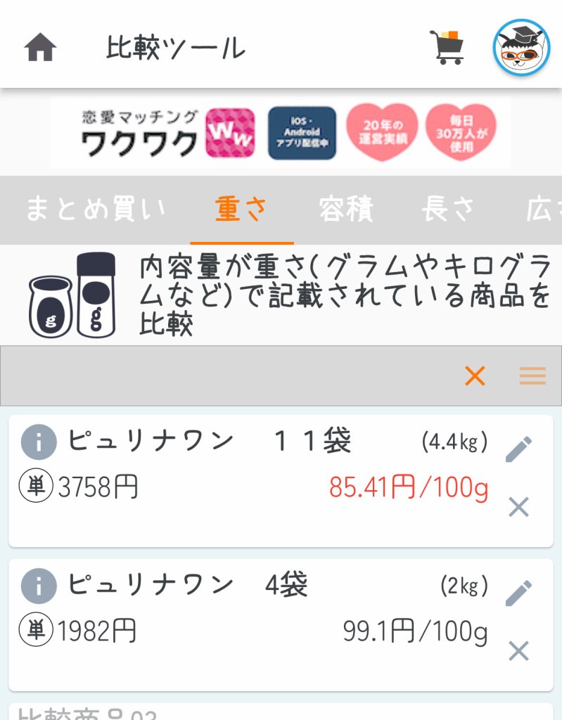 この製品は、gあたりの金額が1円と表示されたままになっていたので、【お使いブギー】を使ってどれだけお得か確認しました。