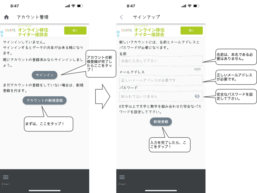 アカウント管理画面で「アカウントの新規登録」ボタンをタップすると「サインアップ」画面が表示されます。サインアップ画面では、名前、メールアドレス、パスワードを入力します。