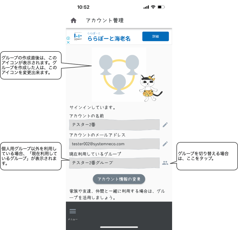 アイコンをタップすると、利用中のグループを切り替えることが出来ます。利用中のグループを切り替えると「アカウント管理」画面の表示内容も切り替わります。