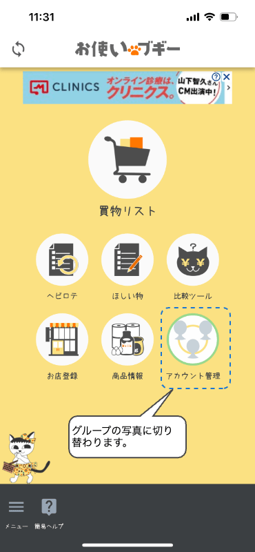 グループを切り替えた状態で表示される買い物リストや、ヘビメタ、ほしい物、お店情報、商品情報はすべて利用中のグループのデータに切り替わります。ホーム画面のアカウント管理アイコンも切り替わります。