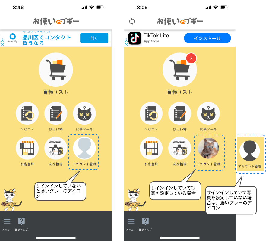 サインインしていない場合、ホーム画面のアカウント管理アイコンは薄いグレーのアイコンになっています。サインインして利用している場合、濃いグレーのアイコンか、アカウント情報で設定してある写真が表示されます。