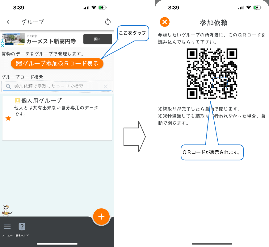 Bさんは、「グループ」画面で「グループ参加QRコード表示」ボタンをタップします。すると、QRコードが表示されます。このQRコードは表示してから30秒間だけ有効です。それ以上の時間が経つと閉じます。QRコードを読み込む前に閉じてしまったらもう一度ボタンをタップして表示して下さい。