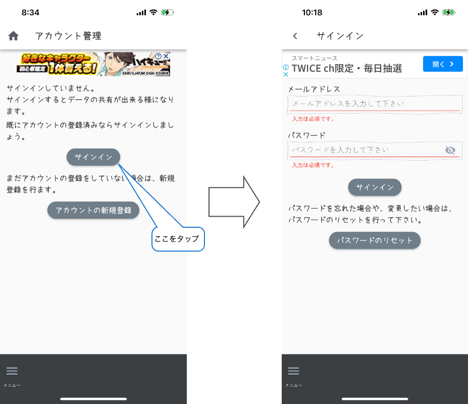 「メールアドレスの確認作業」が完了したら、サインインしましょう。アカウント管理画面で「サインイン」ボタンをタップすると「サインイン」画面が表示されます。サインイン画面でメールアドレスとパスワードを入力して「サインイン」ボタンをタップして下さい。