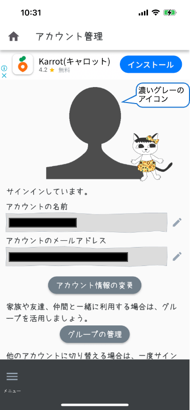 サインインが成功するとアカウント管理画面に「アカウント情報の変更」ボタン、「グループの管理」ボタンなどが表示されます。アカウントアイコン