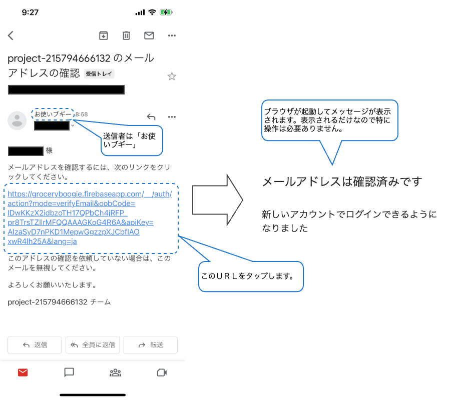 「サインアップ」画面で入力されたメールアドレス宛にメールが送信されます。送信者には「お使いブギー」と表示されます。メールを開くと「https://…」とURLが記載してあるので、それをタップして下さい。ブラウザが起動して「メールアドレスは確認済みです」と表示されたら完了です。この時、特に何かする必要はありません。