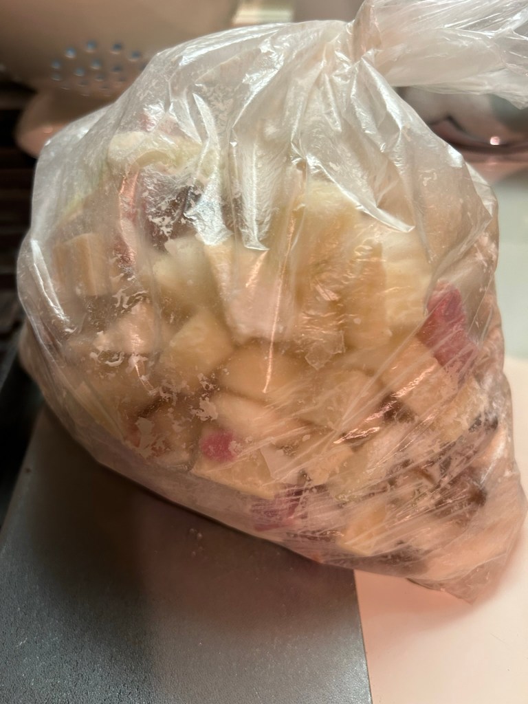 クラムチャウダーの材料を切ったらビニール袋に小麦粉と一緒に入れて、小麦粉となじませます。材料が多いと混ぜるのが大変!頑張ります!