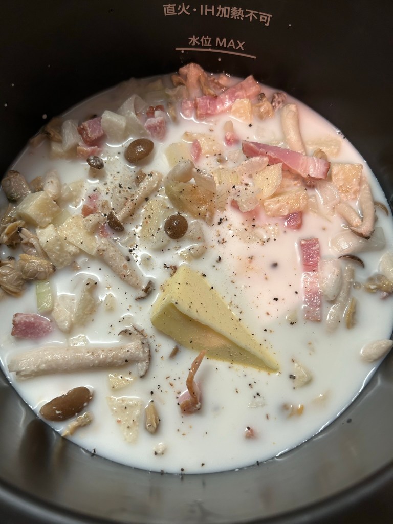 フリフリしたビニール袋の中身を内鍋にあけて、水、あさりの水煮缶の汁、牛乳を入れます。後は、バター、塩コショウ、コンソメ。。。