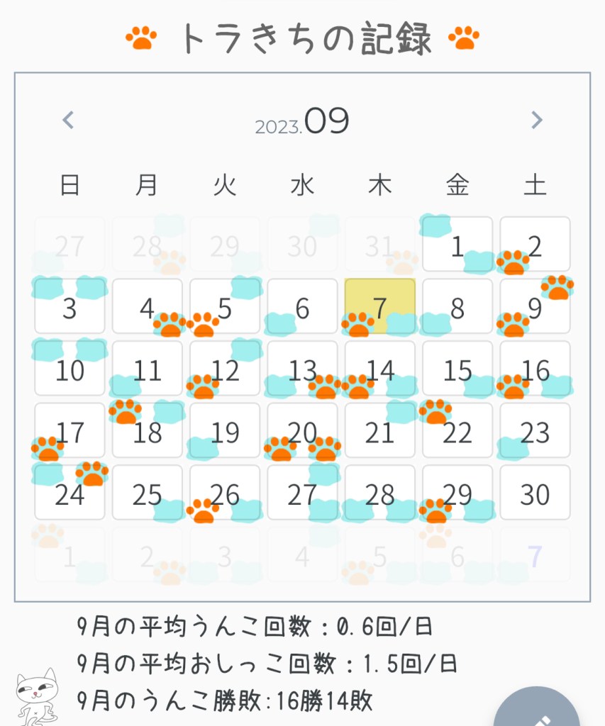 トラきちの9月の平均うんこ回数は、0.6回/日でした。もっと改善するべきですが、8月の0.5回/日よりもよくなりましたので、いっぱいほめてあげたいと思います。おしっこの平均回数1.4回/日から1.5回/日となりましたので改善されました。
