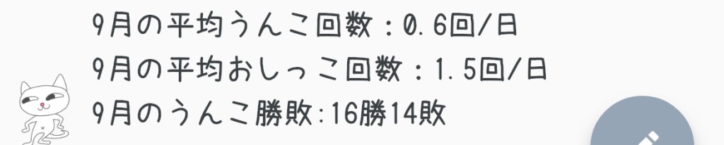 9月のトラきちのうんこ勝敗は、16勝14敗でした。8月の16勝15敗よりも少し改善され、平均うんこ回数は、0.5回/日から0.6回/日に改善されました。
