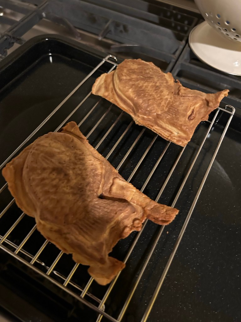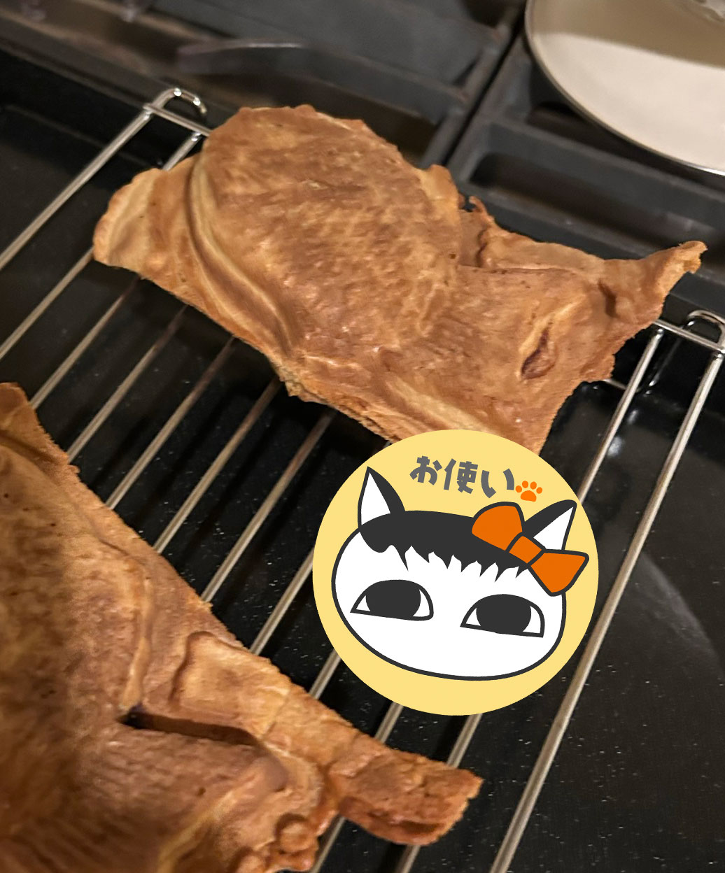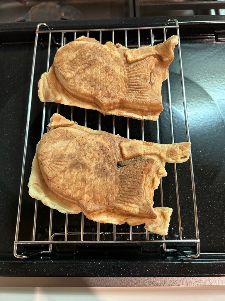 出来あがりました!たい焼きは見事に焼きたてに復活しました。羽根はパリパリ、中はフワフワ、あんこの中心まであったかく仕上がりました。電子レンジだとこうはいかないです。電子レンジはやりすぎると水分が抜けて固くなってしまうし、やりすぎないようにすると冷たいところが出てきてしまうし。。。