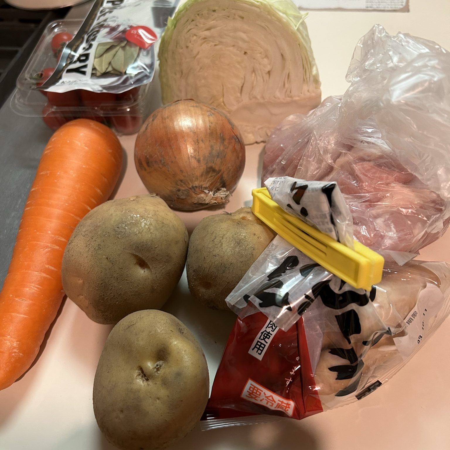 材料は野菜とお肉やソーセージです。ポトフのために買ったものもあるけど、家にあったものも入れます。