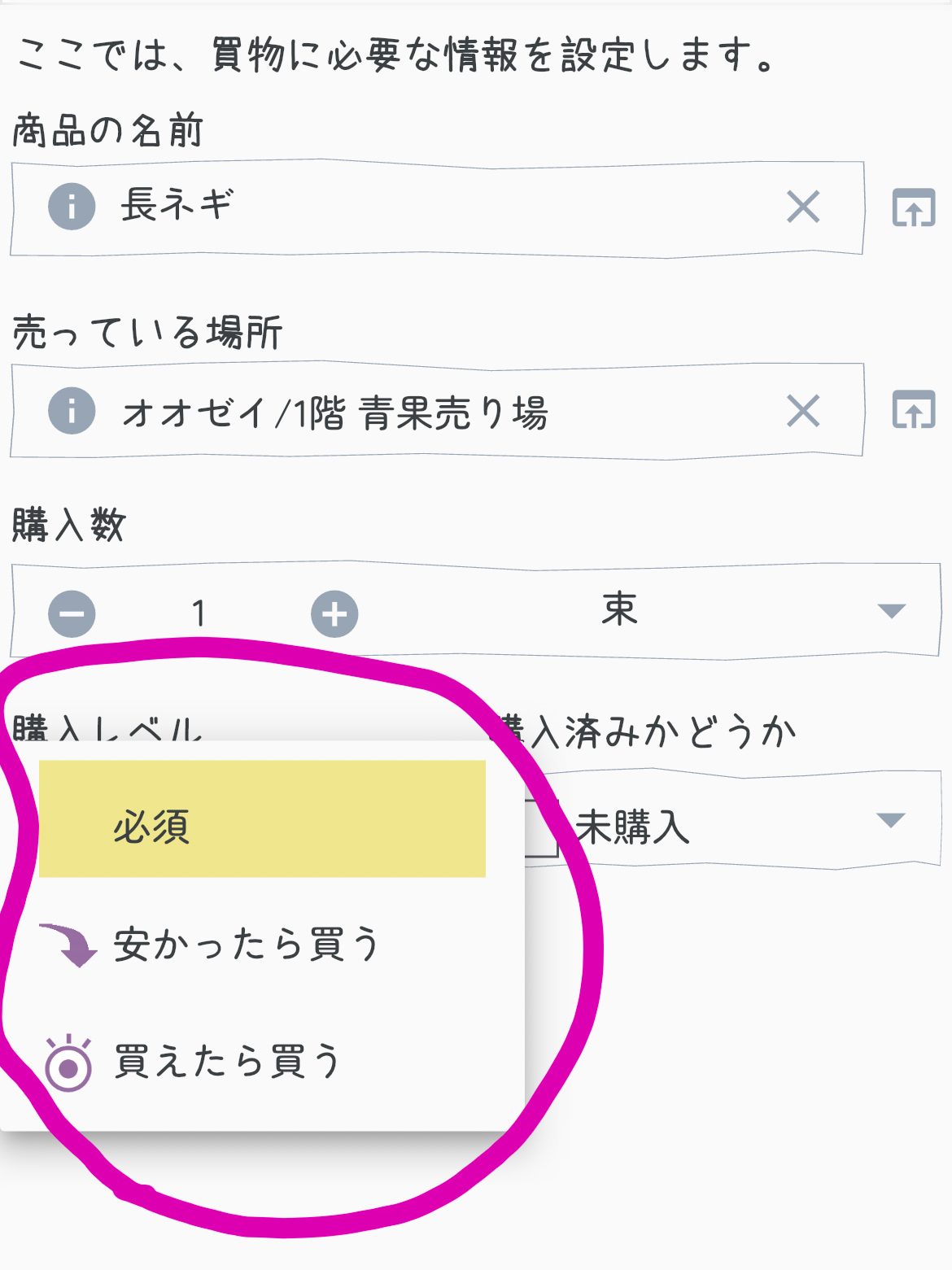 【お使いブギー】では買い物アイテムごとに購入レベルを「必須」、「安かったら買う」、「買えたら買う」の3種類に設定できます。