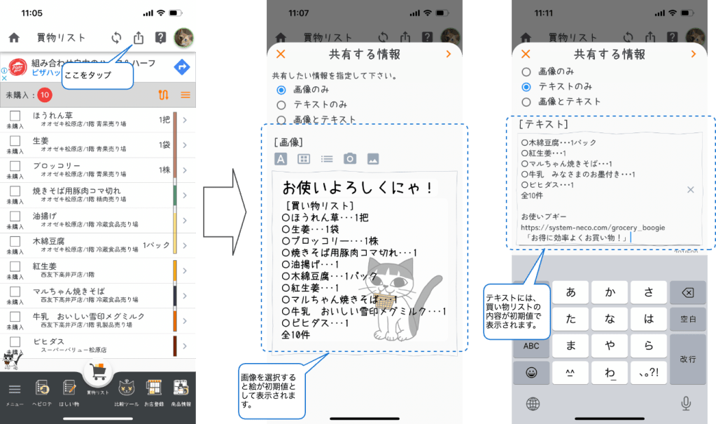 アイコンをタップするとSNSアプリに買物リストを投稿出来る様になります。