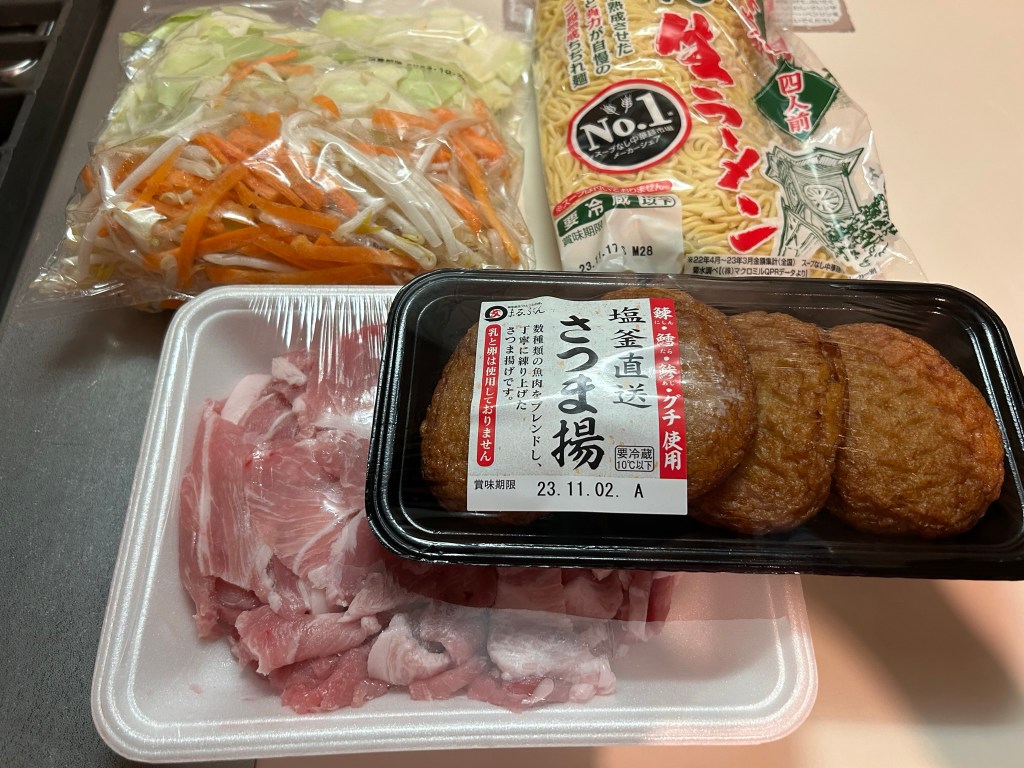 本当は、冷蔵庫の余り野菜を使うところですが、ウィークデーに材料を使い切ってこれから買い出しに行くタイミングなので何もなく、野菜は野菜セットとしました。中華麺は麺だけのもの、後は豚肉とさつま揚げを準備。