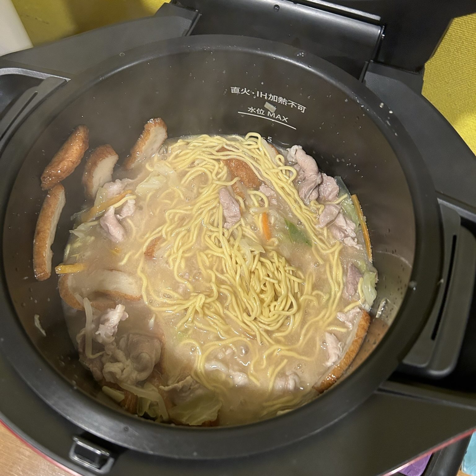 途中で麺を入れるタイミングを教えてくれます。蓋を開けてみるとこんな感じ。