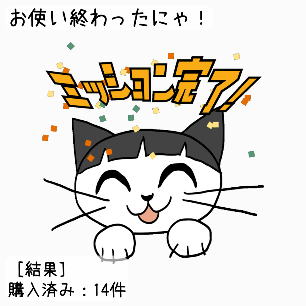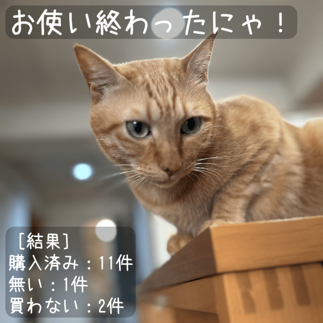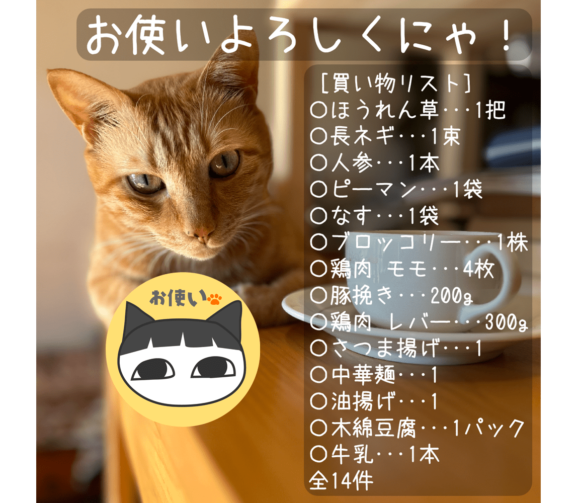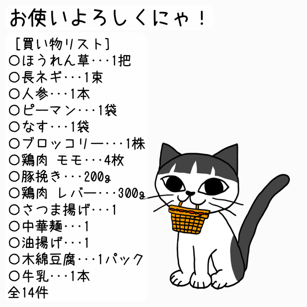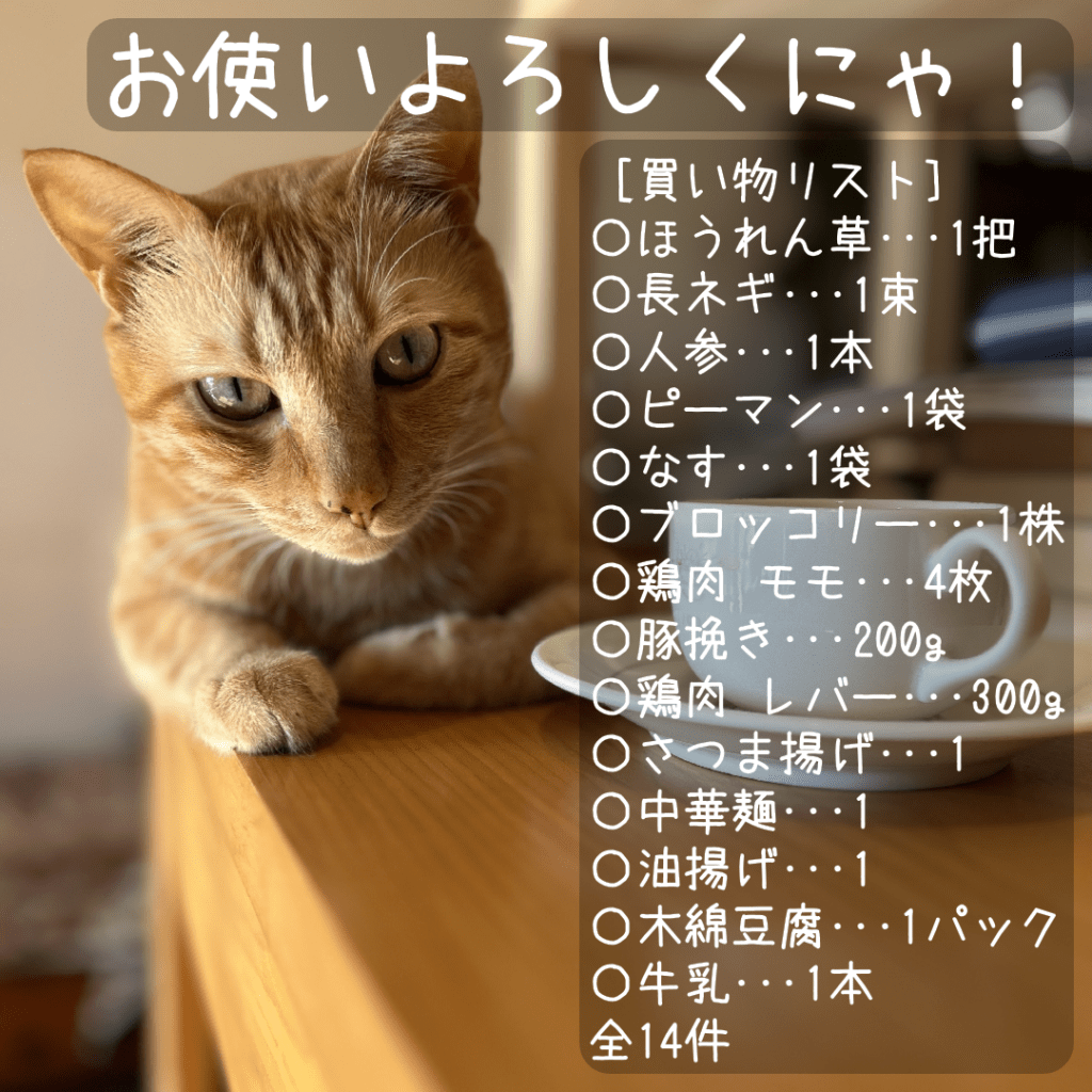 表示されるテキストは、買物リストの状態で変わります。「何を買おうかにゃ?」、「何を買うのかにゃ?」、「お使いよろしくにゃ!」、「お使い行ってくるにゃ!」、「忙し、忙し」、「猫の手も借りたいにゃ!」、「お疲れ様にゃ!」、「お使い終わったにゃ!」などが表示されます。