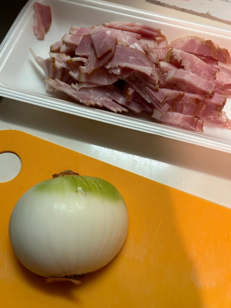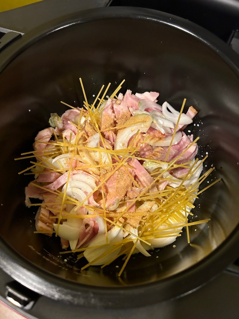 玉ねぎとベーコン、調味料、水と牛乳を入れます。卵はまだ入れません!