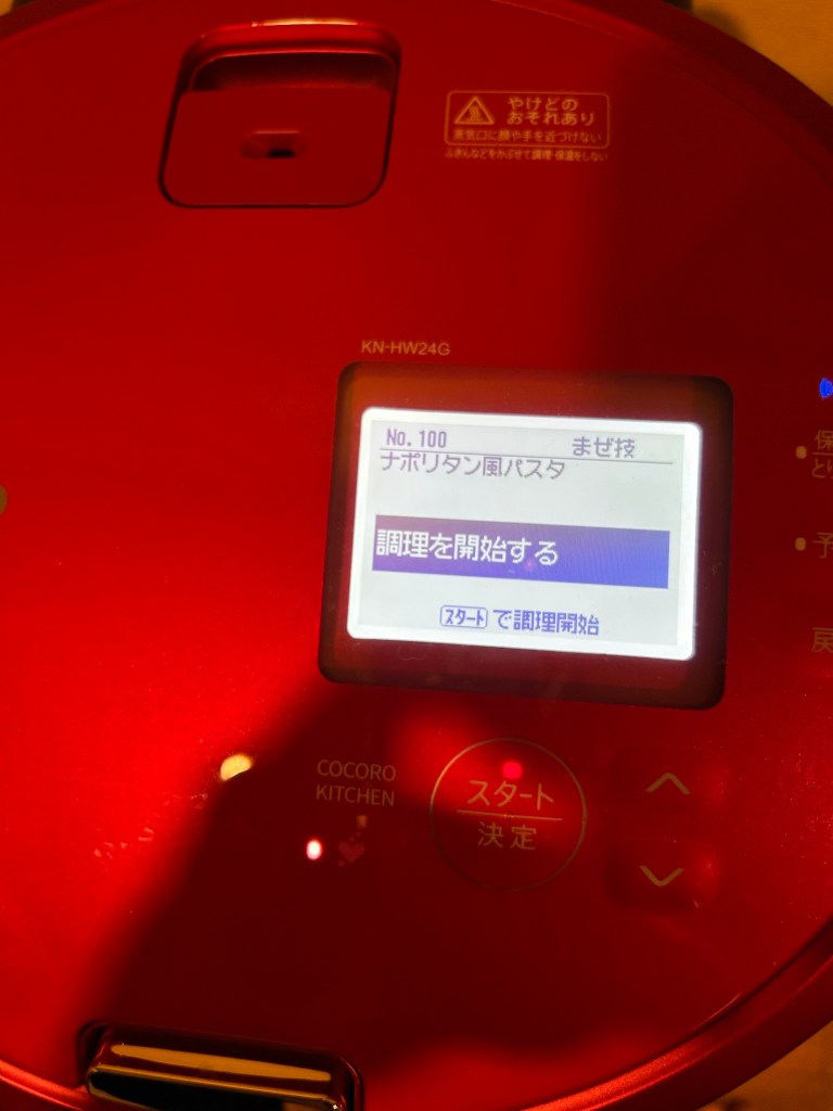 ホットクックのメニューのナポリタン風パスタを選択してスイッチオン