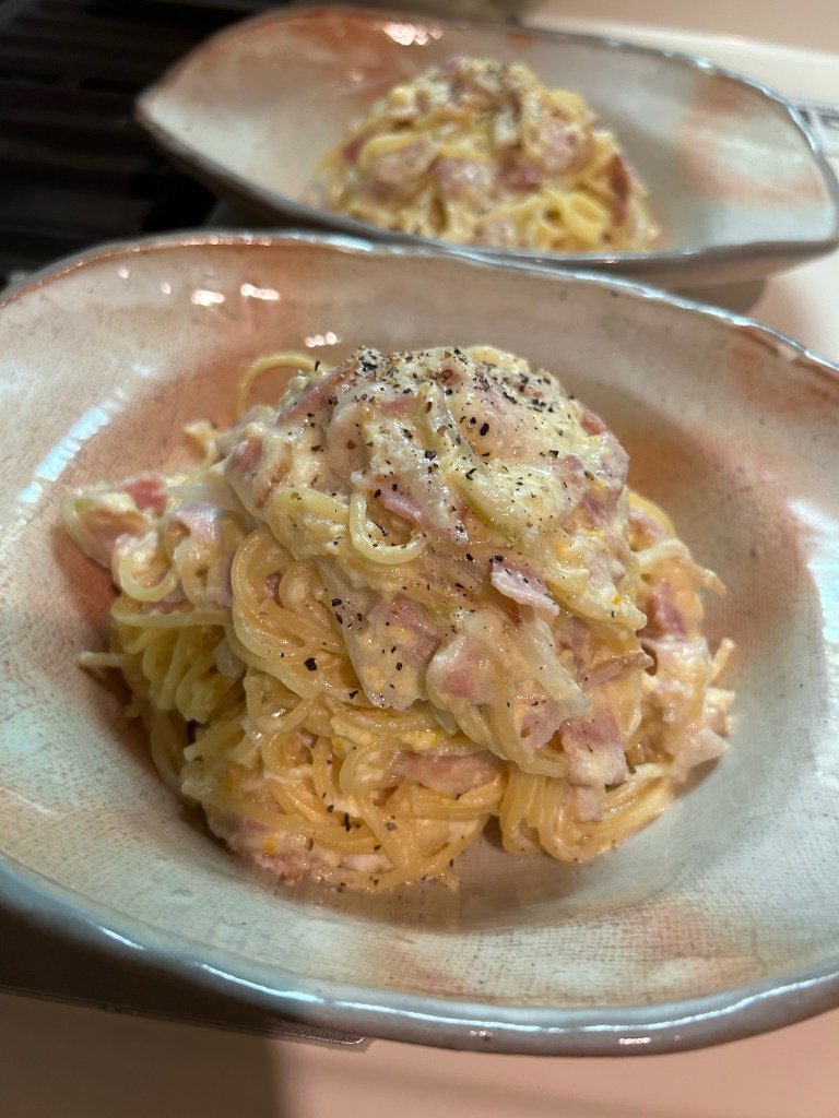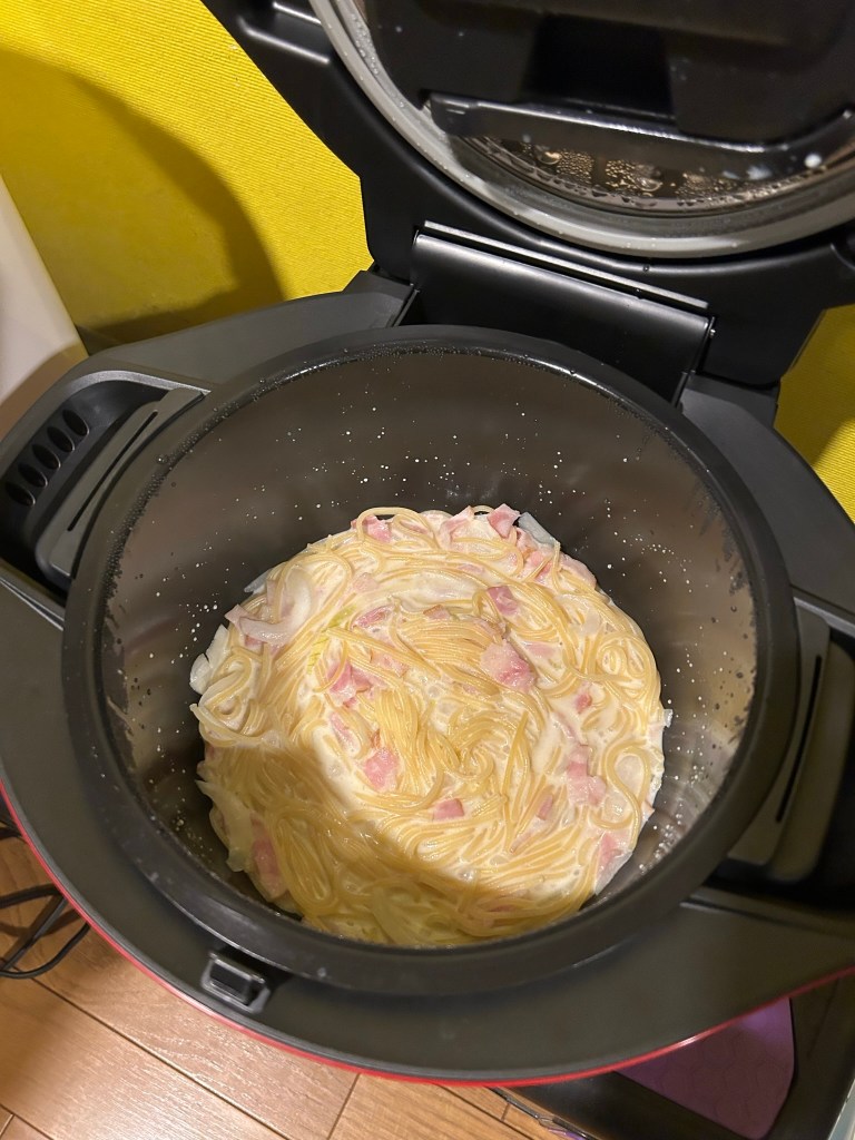 ホットクックでパスタをよく作っています。週末のお昼ご飯に最適なパスタですが、今回はカルボナーラを作ってみました。