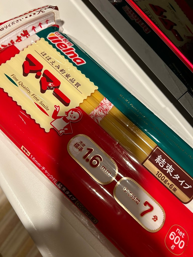 うちではパスタはマ・マーを使っています。1束と半分ずつ使っていて、80gの結束型もあるのに100g結束型をなぜか買っています。最近パスタも値上がりしているため、価格には敏感で安い時に購入するようにしています。