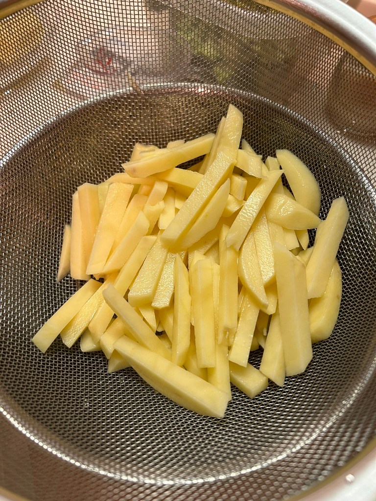 じゃがいもを切ります。太さは好みがあると思いますが、太さをそろえることが必要です。今回はマックのフライドポテトの再現のため、細めに切ります。じゃがいもはあまり大きくないので、マクドナルドにあるような長いものは無理ですが。。