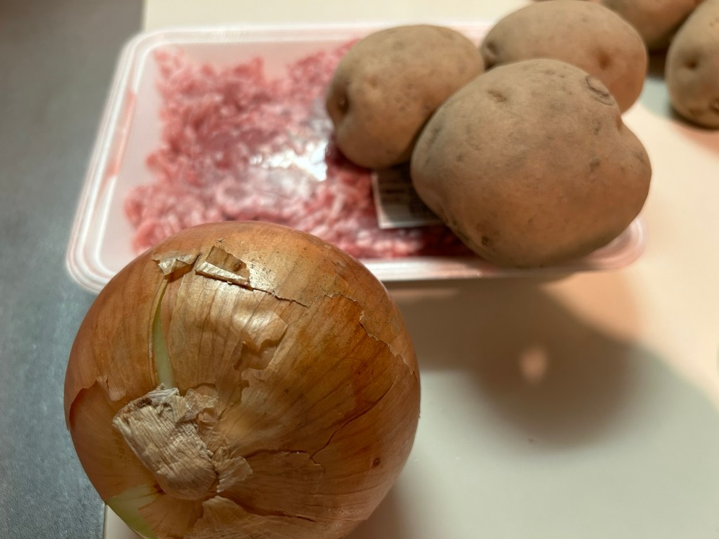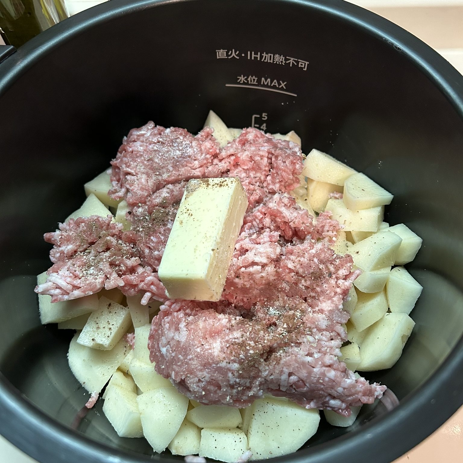 ホットクックの自動メニューにあるものでOK。じゃがいもやひき肉で具を作ります。