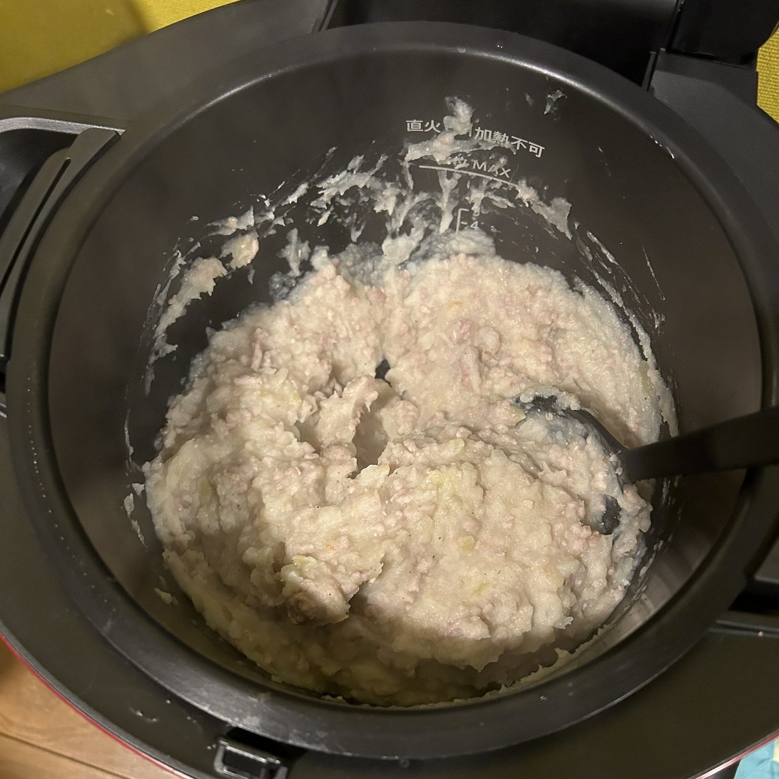 ホットクックを使ってコロッケの具を作ります。材料を入れてスイッチを入れればいいのでとても簡単にできます。
