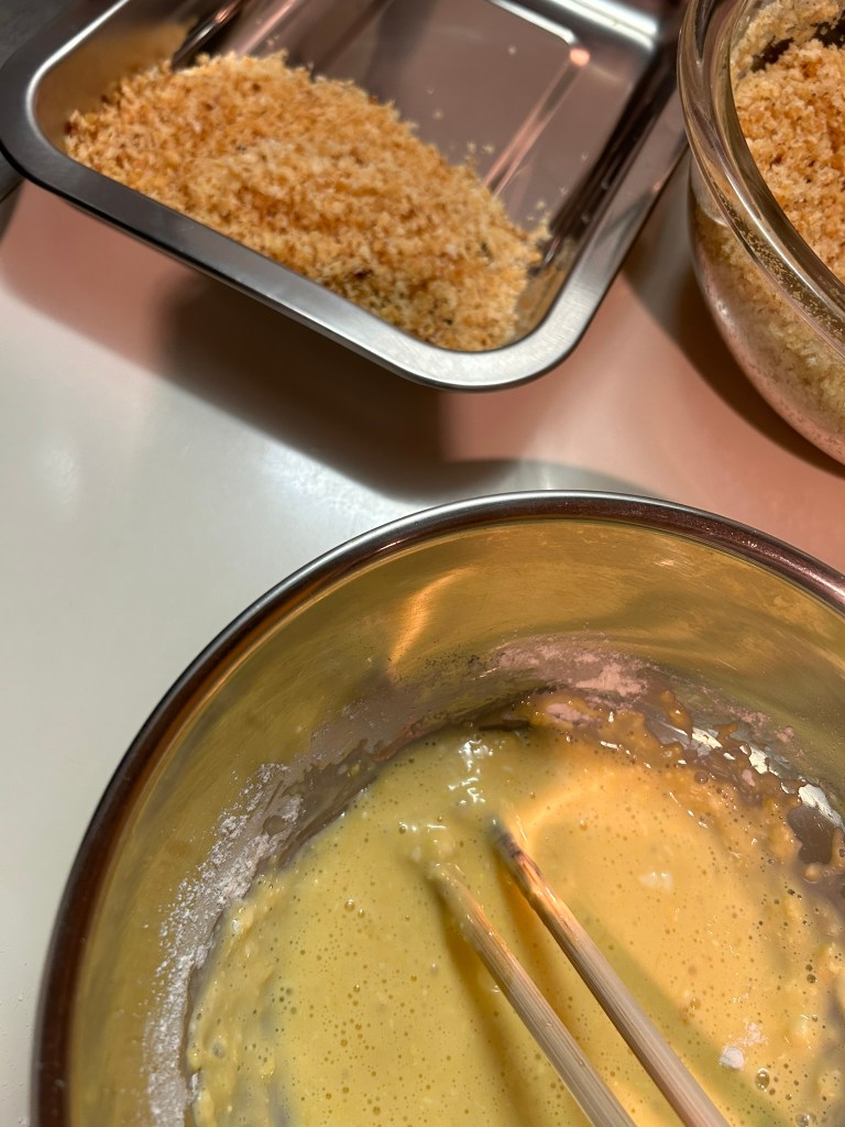 卵と小麦粉と水で衣を作ります。そして、サクサクパン粉も準備します。