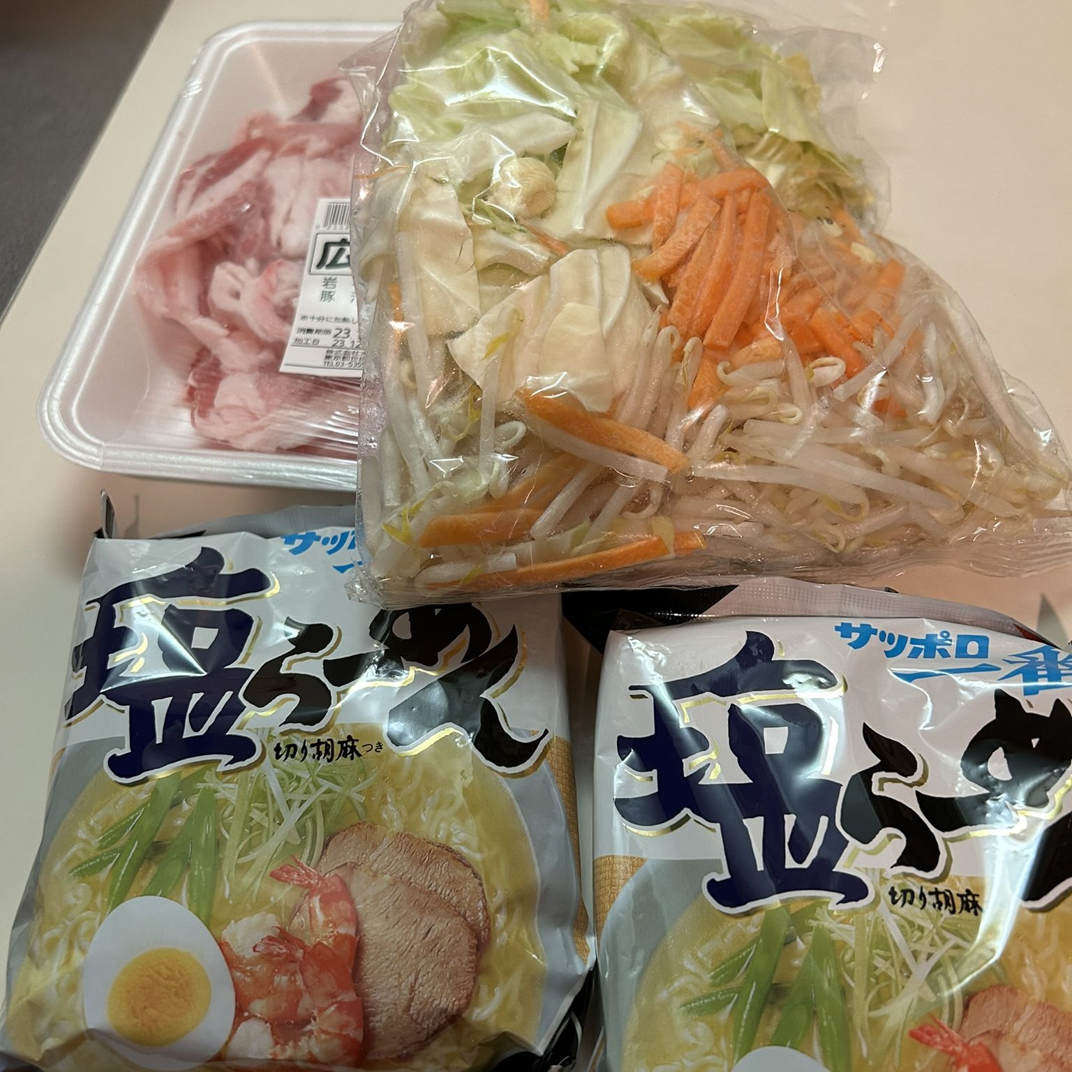 まずは材料ですが、お肉とお野菜、そしてインスタントラーメンです。インスタントラーメンだもの、野菜をたくさん取らねばです。