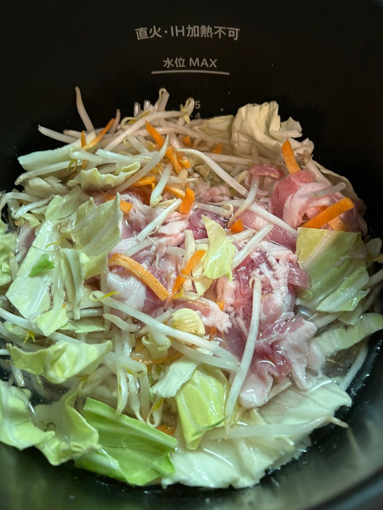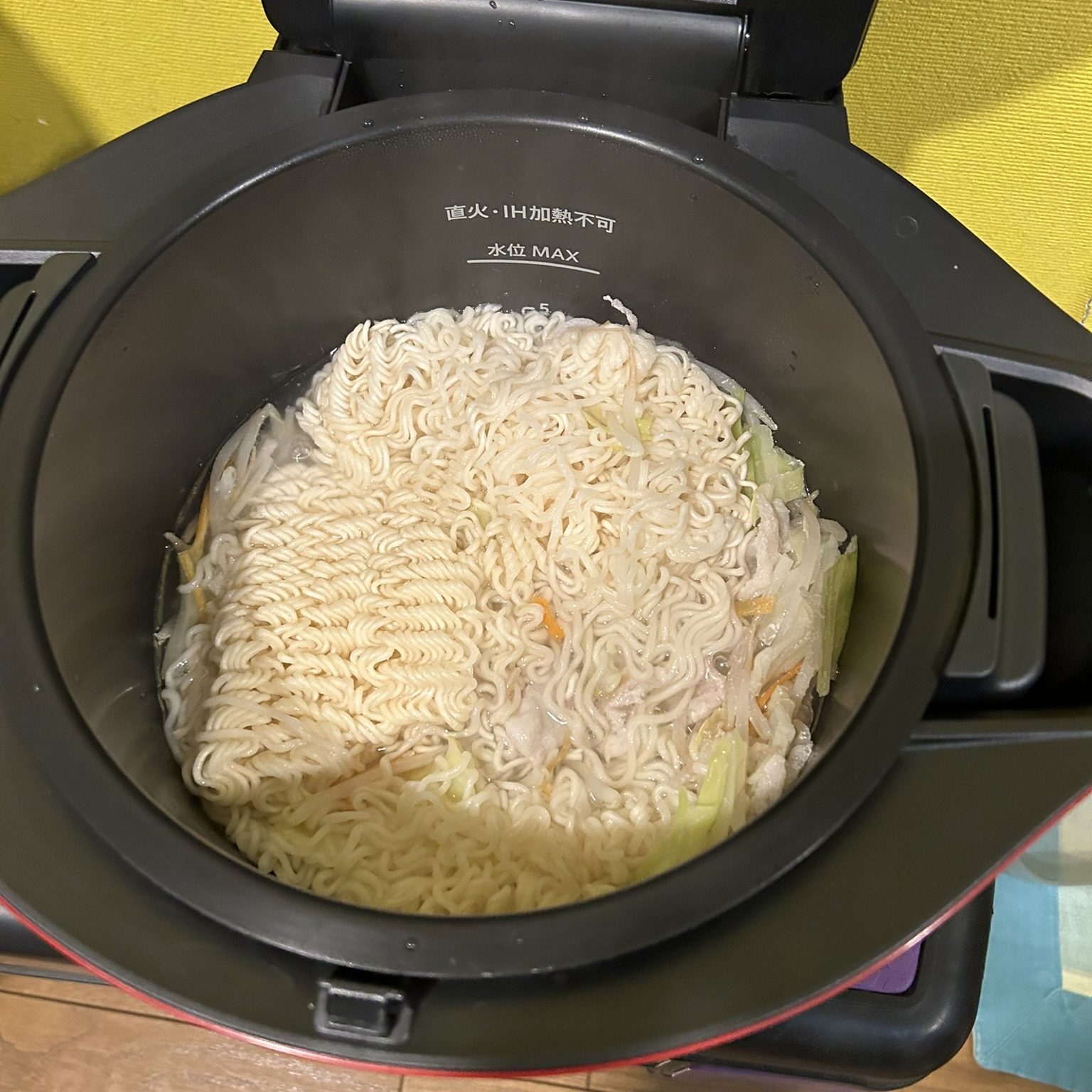 麺を入れるタイミングはホットクックが教えてくれます。「食材を入れてください」と言われたら、麺を入れて、調理を続けます。